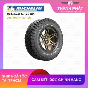Lốp xe BF Goodrich 265/70R17 118/115S All-Terrain T/A KO3 là dòng lốp đa địa hình (All Terrain) cao cấp thế hệ mới của BF Goodrich, được thiết kế cho SUV và bán tải 4×4 cần khả năng vận hành mạnh mẽ, độ bền cao và độ bám vượt trội trên mọi loại địa hình.