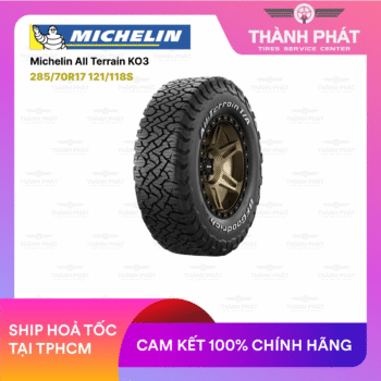 Lốp xe BF Goodrich 285/70R17 All Terrain KO3 – dòng lốp đa địa hình cao cấp dành cho SUV và bán tải cỡ lớn. Nổi bật với độ bám mạnh mẽ, độ bền vượt trội và khả năng chống cắt rách cực tốt. Phù hợp cho các dòng xe như Ford Ranger Raptor, Toyota Hilux, Jeep Wrangler.